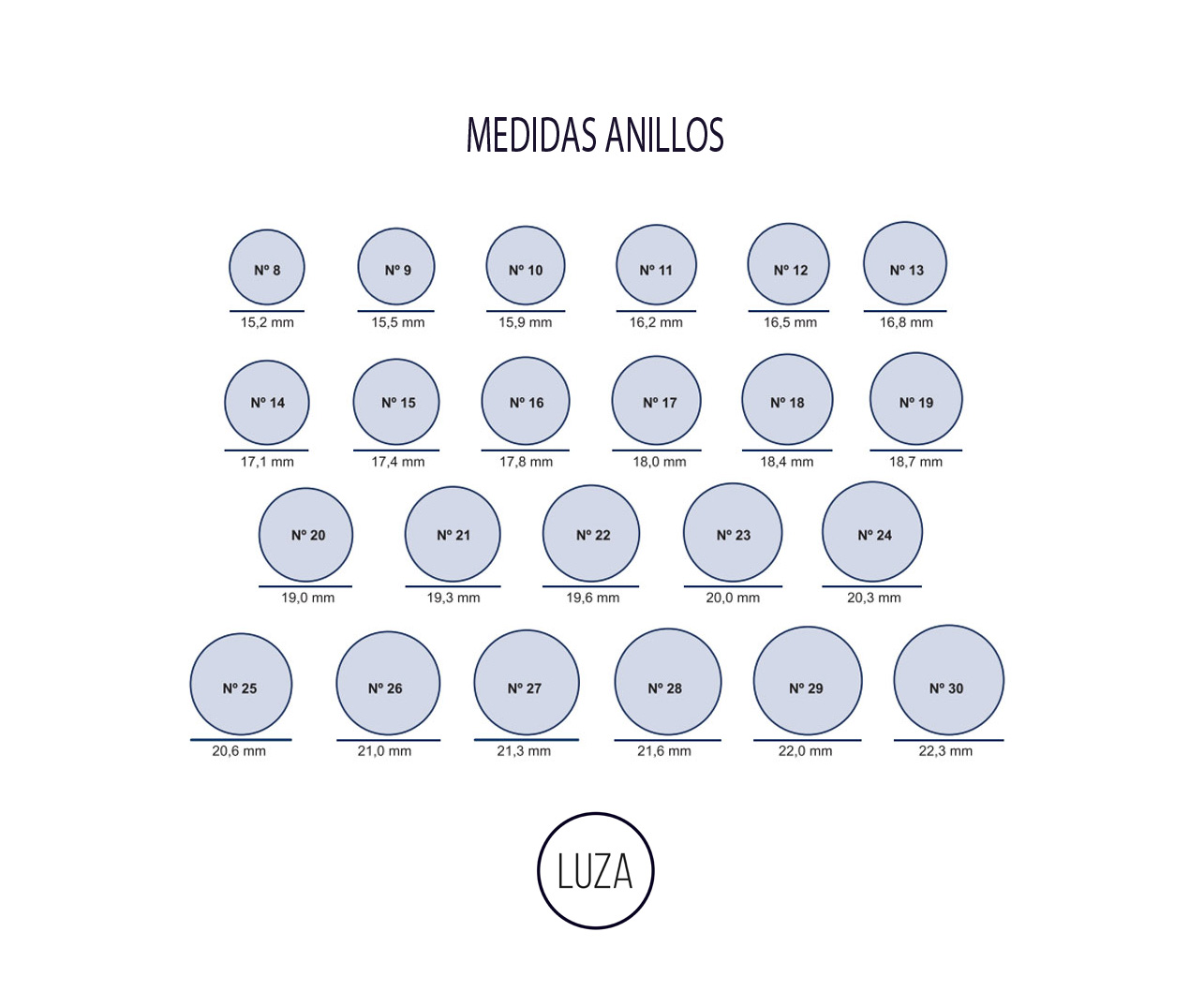 Elegir un anillo que les guste su medida y medir con una regla el diámetro, y así compararlo con esta tabla de medidas.